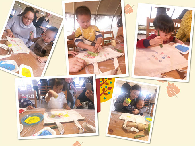 原來老師給我們表演的是---拓印藝術。一只白色的小布袋,三種不同顏料,還有蔬菜根,不一會兒一只充滿藝術feel手提袋誕生啦!寶貝們都是棒棒的!