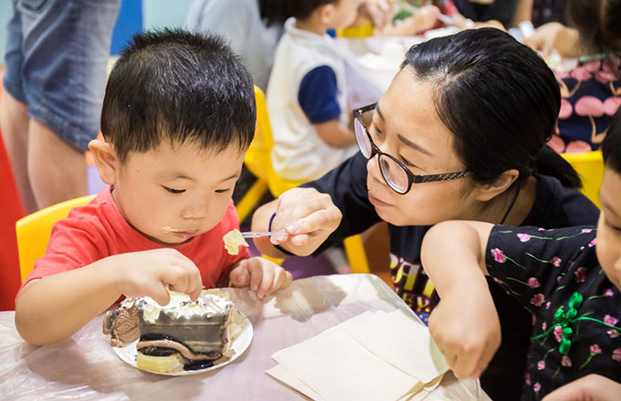 瞧,我們的月餅蛋糕登場了啊,看寶貝們吃的多開心。