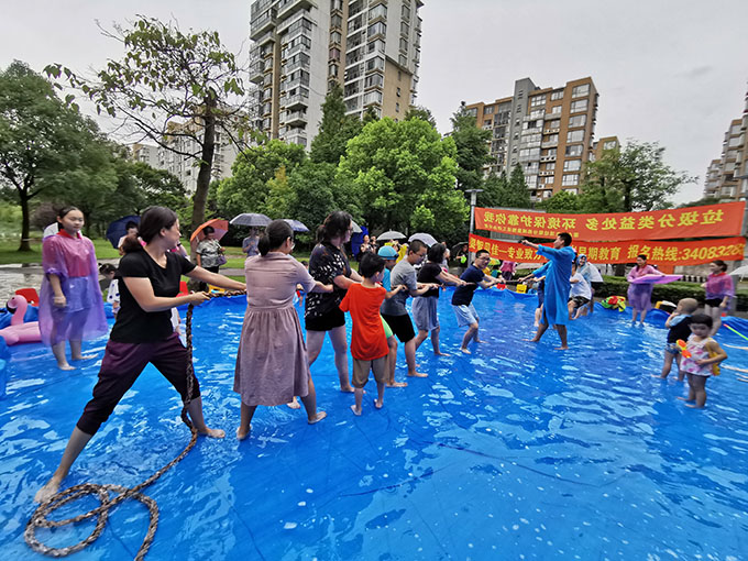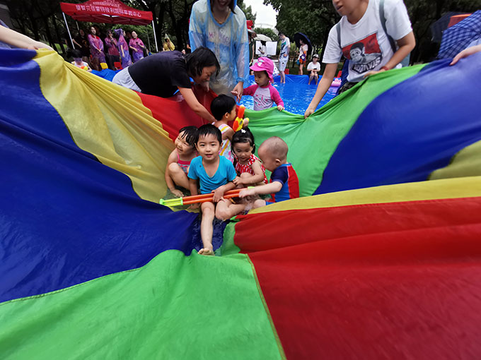 接下來(lái)的游戲是水中運(yùn)物,有請(qǐng)示范老師,游戲規(guī)則是十人為一組,將寶貝放在彩虹傘里,家長(zhǎng)拉著彩虹傘跑一個(gè)來(lái)回,兩組同時(shí)開始,最先回到起點(diǎn),用時(shí)最短者獲勝,準(zhǔn)備好了嗎?音樂(lè)響起,我們就要開始咯
